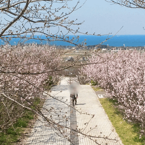 入り口から見た時点で、公園内のピンク色の「あんずの木」がたくさんあるのがわかります。