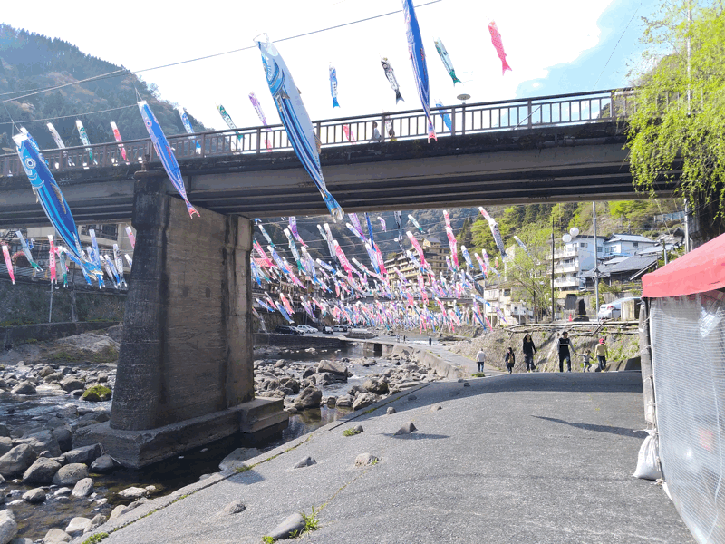 この時期の「杖立温泉」は、川にたくさんの「鯉のぼり」が泳いでいるのです。